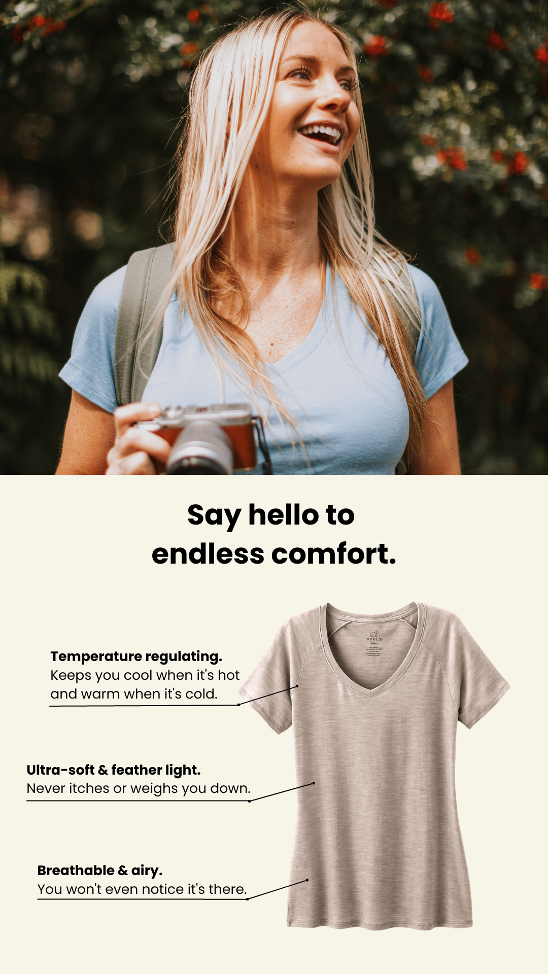 • Breathable & Moisture Wicking. Moisture is a comfort killer. Merino solves this issue with ease.